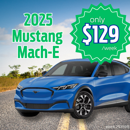 All payments are plus applicable taxes, fees, and levies. Lease offer available on 2025 Ford Mustang Mach-E Select (stock #253598). Lease payment of $129 per week is based on a 60-month lease at 6.29% APR, with a $2,500 cash down payment required and $5,000 Federal EVAP electric vehicle incentive (see linked government website for program details and eligibility.) Additional amounts may be due on delivery.