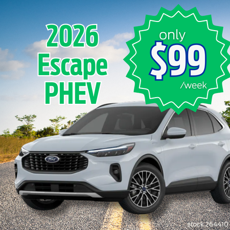 All payments are plus applicable taxes, fees, and levies. Lease offer available on 2026 Ford Escape PHEV (stock #264410). Lease payment of $99 per week is based on a 60-month lease at 2.99% APR, with a $2,500 cash down payment required and $2,500 Federal EVAP electric vehicle incentive (see linked government website for program details and eligibility.) Additional amounts may be due on delivery.