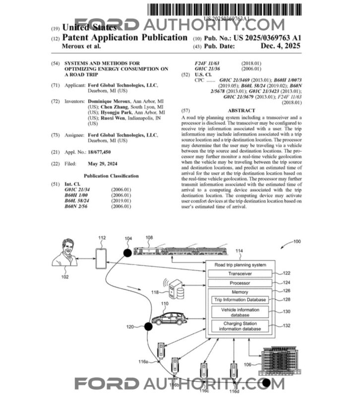 The patent outlines a road trip energy consumption optimization system designed to take much of the guesswork out of EV travel. Instead of simply reacting to battery levels along the way, the system would start planning before the trip even begins. By factoring in the destination, route, and timing, a future Ford EV could automatically pre-condition its battery and cabin while also identifying the most efficient charging stops along the journey.