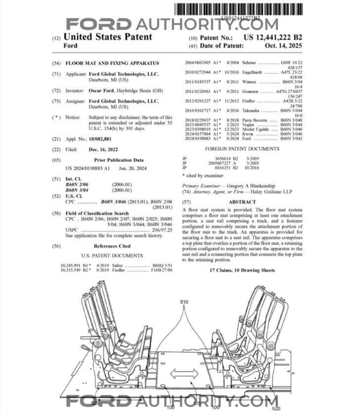 Filed on December 16, 2022, and published on October 14, 2025, the patent describes a floor mat and fixing apparatus that could be used in future Ford vehicles. Rather than relying solely on traditional hooks or clips, the proposed system would secure the floor mat directly to the seat rail, significantly reducing the chance of unintended movement.