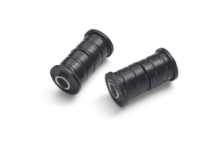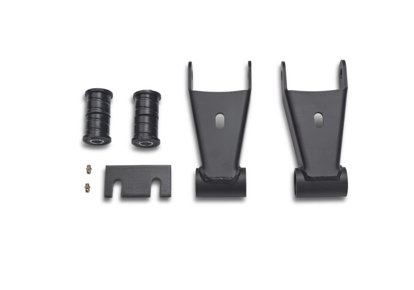 The kit includes laser-cut steel lowering shackles paired with urethane bushings and incorporates several durability upgrades. These include a grease fitting on the lower shackle tube, a dedicated bushing grease groove, and improved DOM center tube tolerances to enhance long-term performance and serviceability.