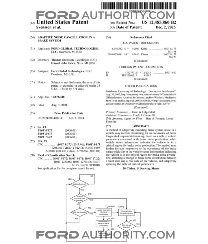 According to the filing, Ford Motor Company is exploring an adaptive noise cancellation system specifically designed for vehicle braking. Rather than relying on traditional fixes like brake material changes alone, this system would actively monitor braking conditions and adjust brake force distribution to reduce or eliminate noise before it becomes noticeable.